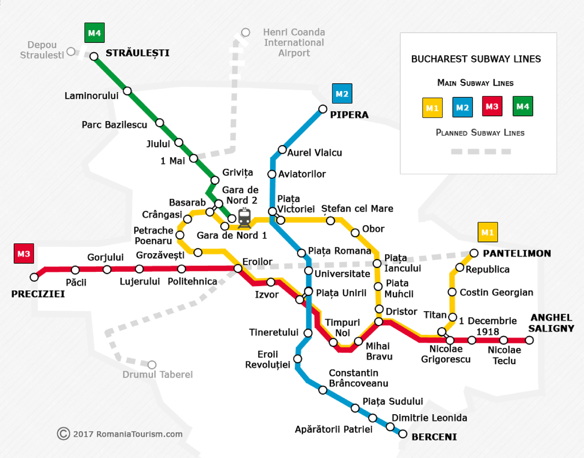 To reach the train station by metro: take the metro at the Plata Unirii stop, take the yellow line to the Gara De Nord stop.